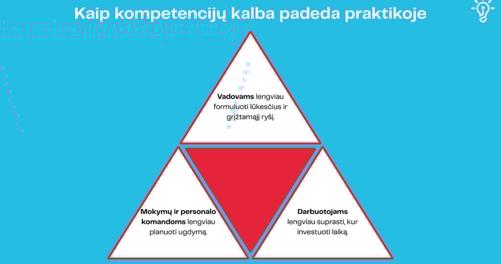 Kai organizacijoje atsiranda kompetencijų kalba, pasikeičia keli labai praktiški dalykai.
