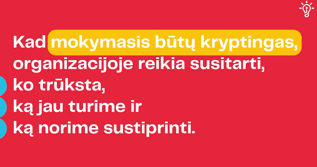 Kad mokymasis būtų kryptingas, organizacijoje reikia susitarti, ko trūksta, ką jau turime ir ką norime sustiprinti. Čia ir prasideda kompetencijų kalba. Kompetencijos padeda įvardyti gebėjimus žodžiais, išsigryninti prioritetus, palyginti dabartinę situaciją su siekiamu lygiu, susieti ugdymą su organizacijos kryptimi.